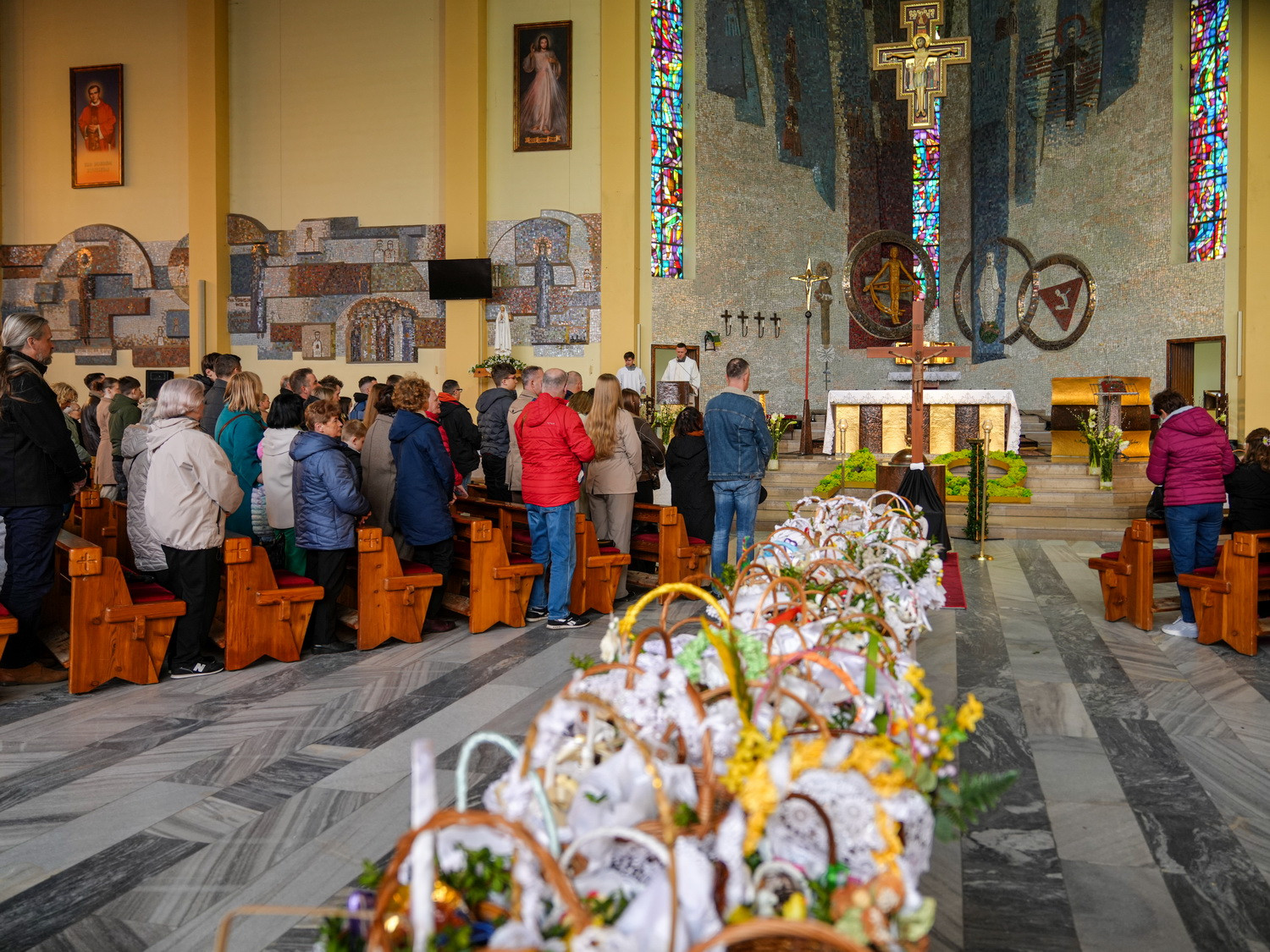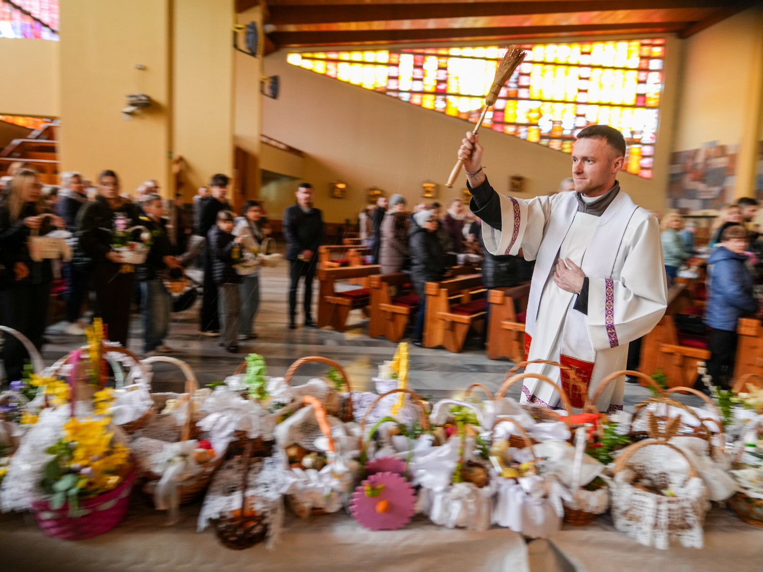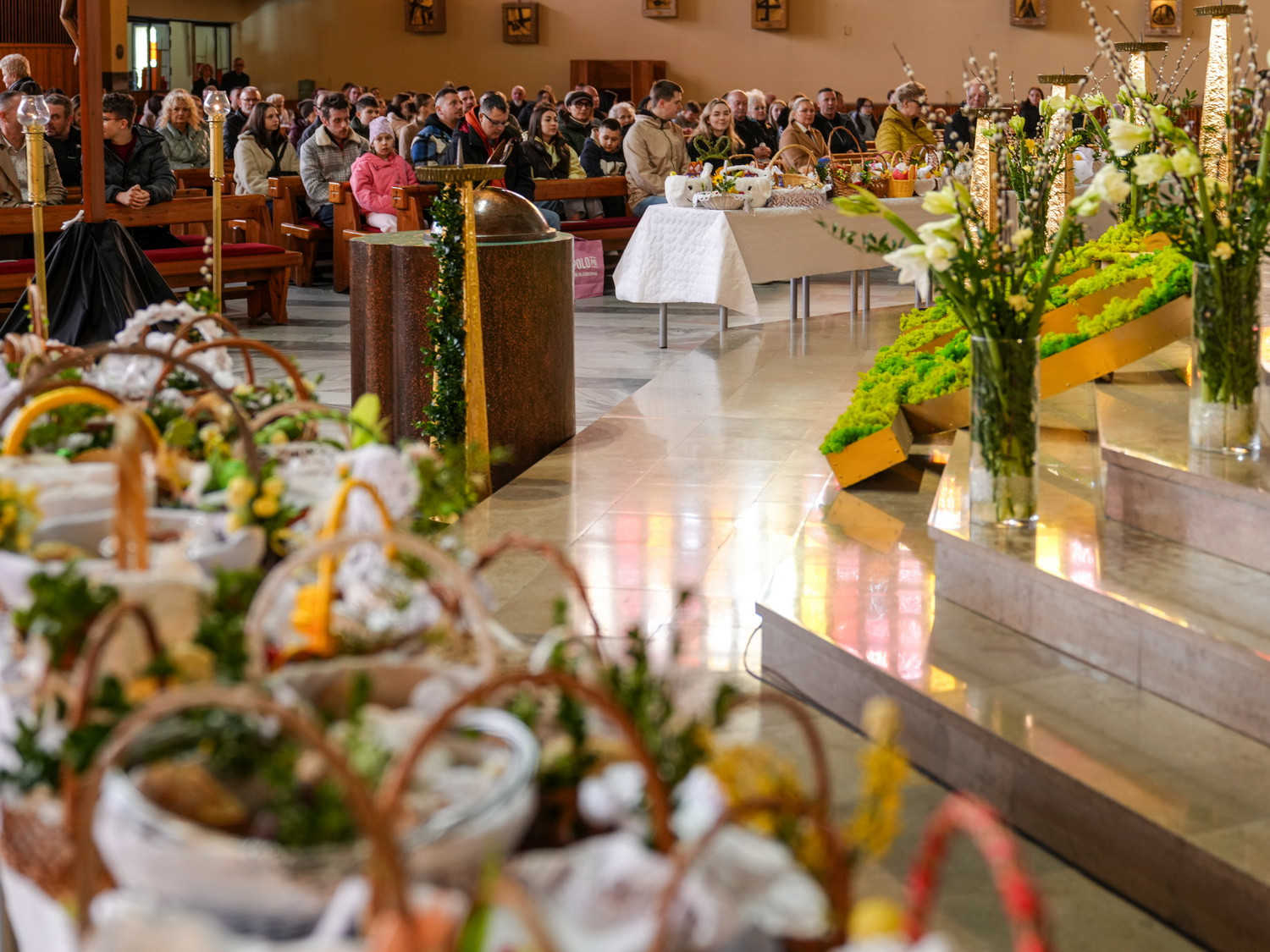 Od godzin porannych do świątyni przybywały całe rodziny, przynosząc koszyczki wielkanocne wypełnione symbolicznymi pokarmami. Obrzęd ich poświęcenia odbywał się w atmosferze ciszy i zadumy, przypominając o głębokim znaczeniu tego dnia – trwania przy Chrystusie spoczywającym w grobie i oczekiwania na Jego Zmartwychwstanie.