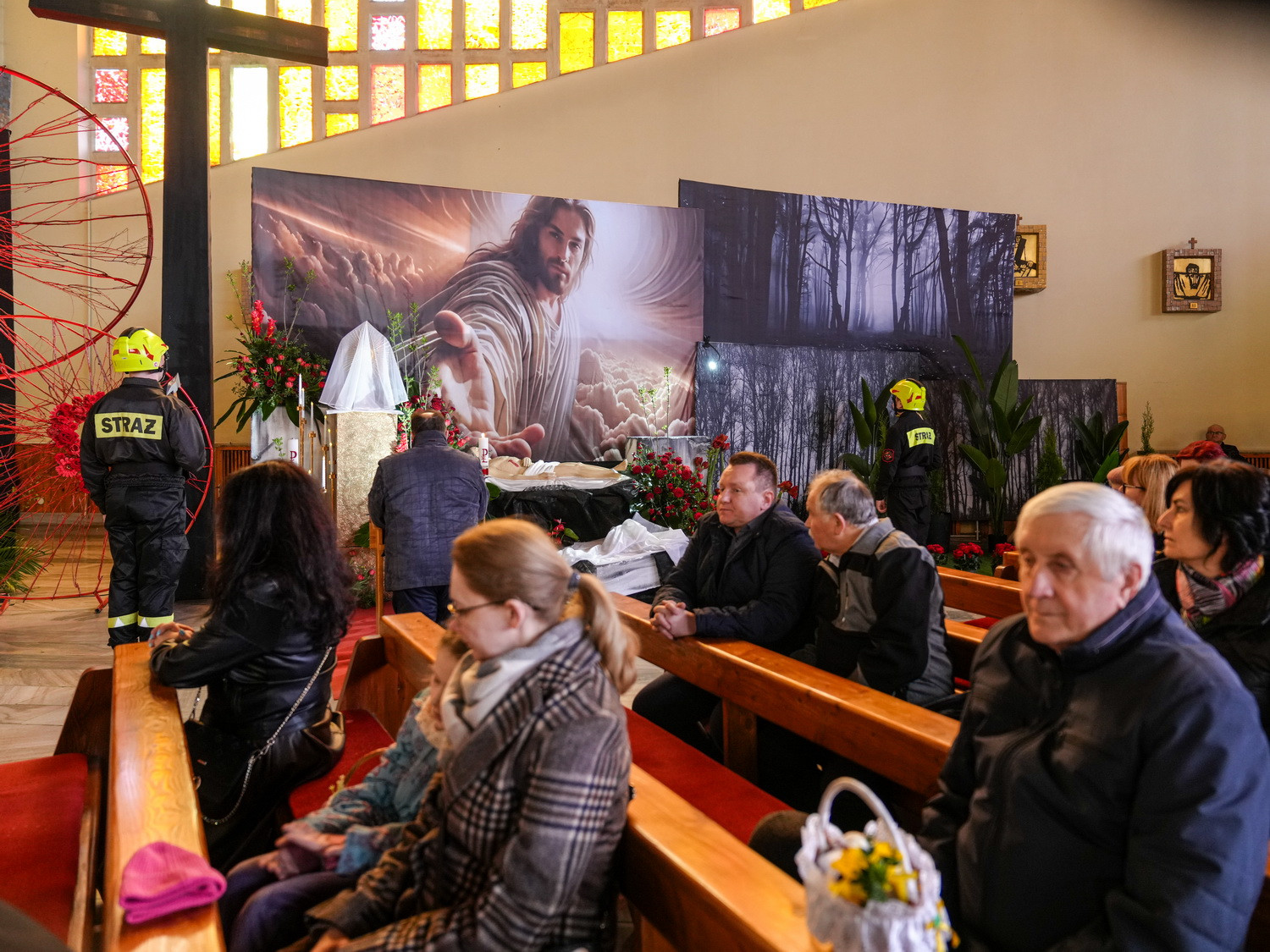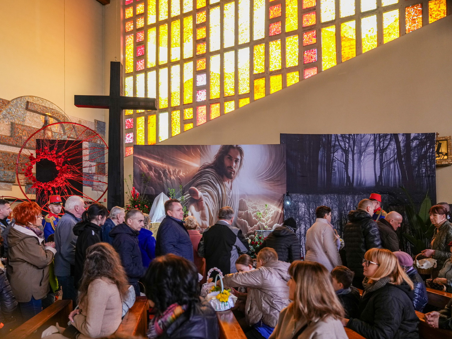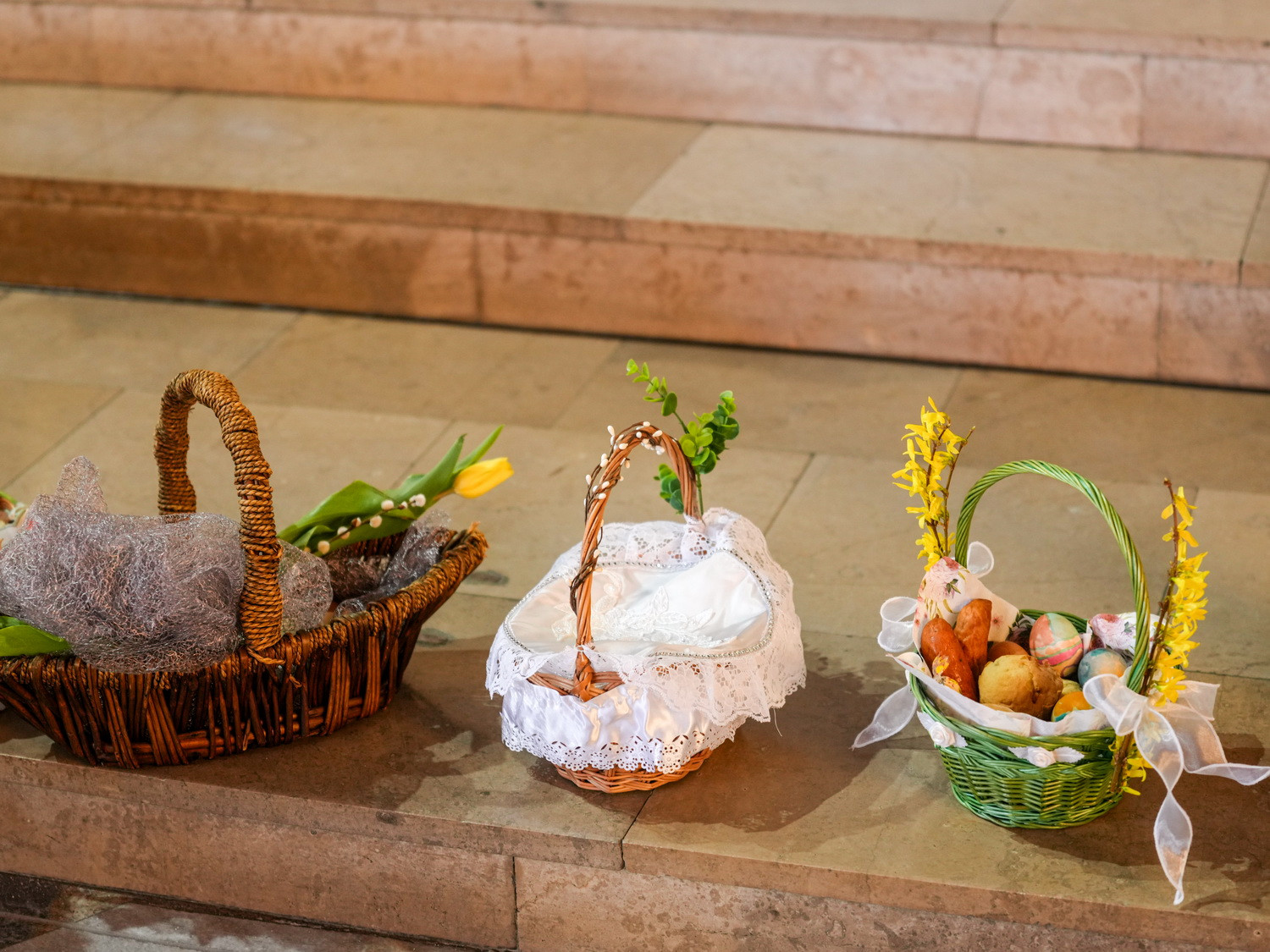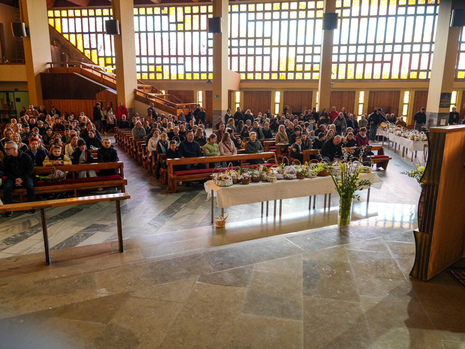 Od godzin porannych do świątyni przybywały całe rodziny, przynosząc koszyczki wielkanocne wypełnione symbolicznymi pokarmami. Obrzęd ich poświęcenia odbywał się w atmosferze ciszy i zadumy, przypominając o głębokim znaczeniu tego dnia – trwania przy Chrystusie spoczywającym w grobie i oczekiwania na Jego Zmartwychwstanie.